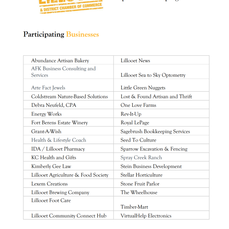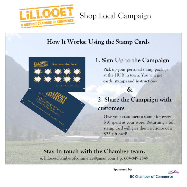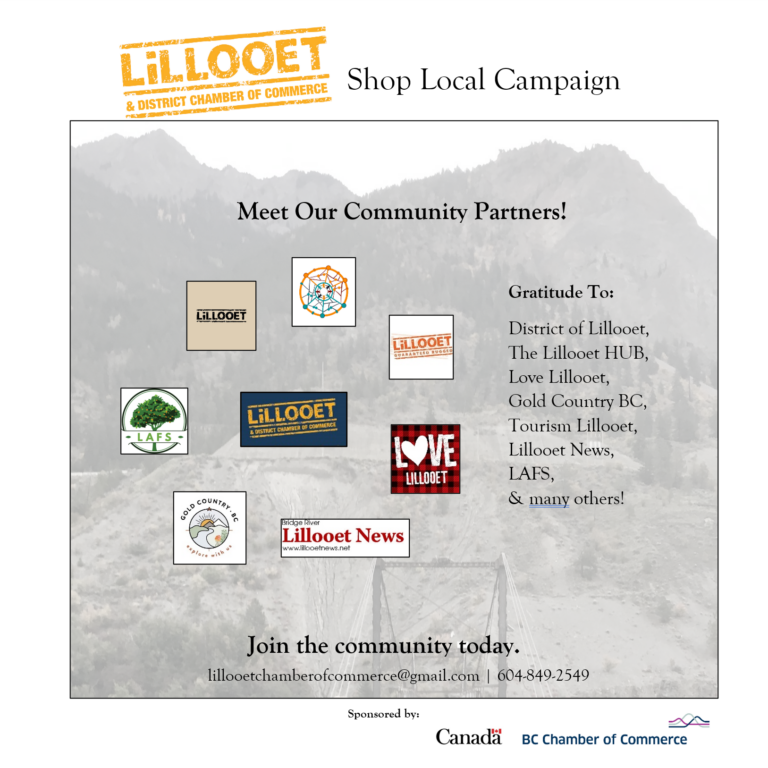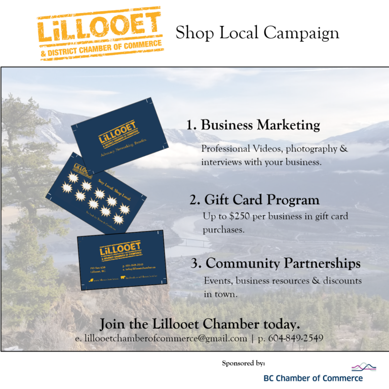 The Lillooet Chamber of Commerce is hosting our first Shop Local Campaign! Lillooet businesses can sign up to receive (1) a free marketing campaign for your business; (2) up to $10,000 in gift cards; and (3) new community partnerships and discounts in town.