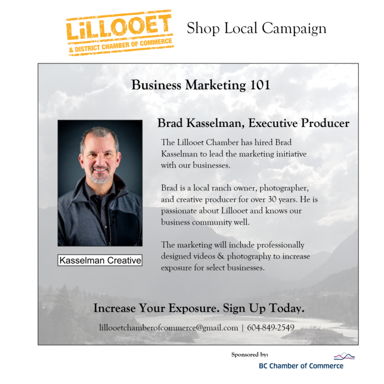 Contact the Lillooet Chamber to be part of the campaign. Receive free marketing, professional videography, $250 in gift cards, and new partnerships in town!